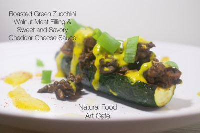 Once walnut meat filling and your sweet and savory (or sharp) cheddar cheese sauce are done, place halved roasted zucchinis on a serving plate then add walnut meat filling over their tops and drizzle on a generous amount of cheese sauce. If interested, add a bit of chopped green scallions or holiday garnish on top of the sauce and/or around the serving plate. This dish is now ready to be the center holiday main dish on your table.